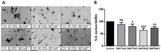 (A) Field emission scanning electron microscopy (FE-SEM) on G nanoplatelets fabricated with different conditions. (B) Biofilm inhibition for S. aureus. The asterisks denote significant difference compared to control (*: p < 0.05, **: p < 0.01, and ***: p < 0.001). ‘ns’ refers not significant. Data reproduced from Ref. [77]. Copyrights MDPI 2020.
