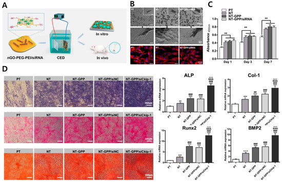Meanwhile, GO can be used as a drug delivery system owing to its wide surface area, chemical and mechanical constancy, sublime conductivity, and biocompatibility [114]. The dual usage of GO was investigated as a siRNA delivery system and osteogenesis-inducing component for a Ti implant (Figure 4A) [81]. The siRNA showed great potential for bone regeneration of the implant with its tissue targetability and high specificity [115,116]. Osteogenic efficacy of the NT/GO-PEG-PEI/siRNA composite was evaluated both in vitro (MC3T3-E1 cell) and in vivo (mouse). The GO-PEG-PEI/siRNA composite enhanced cell adhesion, proliferation, uptake/knockdown efficiency of siRNA, an increase of ALP activity, collagen secretion, and ECM mineralization (Figure 4B–D). Van Gieson staining and EDX scanning of mouse bone cylindrical implants after one month of implantation revealed enhanced osseointegration and new bone formation. The MH-loaded GO films on implant abutment were investigated for peri-implantitis treatment [82]. In this study, GO film was also dual-used for osseointegration and MH-delivery system. MH is a tetracycline antibiotic that exhibits antibacterial properties against S. aureus, E. coli, and S. mutans [117,118]. The MH-loaded GO implants were fabricated and implanted in a peri-implantitis model in beagle dogs. The micro-CT tomography and histological evaluation demonstrated not only the osseointegration effect of MH-loaded GO implants but also the prevention and therapeutic effect for peri-implantitis mainly due to their excellent antibacterial activity.