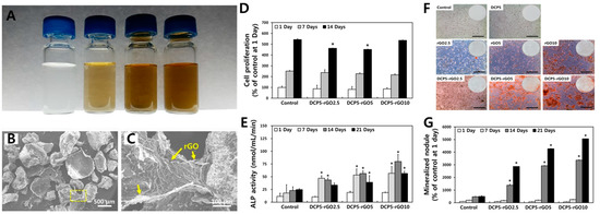 DCP-rGO hybrid composites for osteogenesis of MC3T3-E1 preosteoblasts. DCP and rGO at concentration ratios of 5:2.5, 5:5, and 5:10 μg/mL were designated as DCP5-rGO2.5, DCP5-rGO5, and DCP5-rGO10, respectively. (A) (From the left) Digital images of phosphate-buffered saline (PBS), rGO2.5, DCP5-rGO5, and DCP5-rGO10. (B) Low and (C) high magnification SEM of DCP-rGO hybrid composites. (D) Proliferation, (E) ALP activity, (F) macroscopic images of ARS staining, and (G) mineralization nodules of MC3T3-E1 cells cultured with DCP-rGO composites. An asterisk (*) denotes significant difference compared to the control of the same day. Data reproduced from Ref. [86]. Copyrights MDPI 2017.