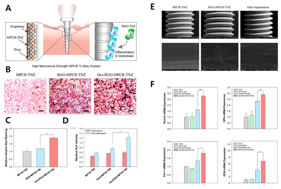 rGO has chemical and physical nature different from those of G and GO. The structural deficiency with residual functional moieties can be sharply tailored. For example, surface oxygen content and degree of reduction have significant influence on protein adsorption and effects on cellular behaviors [123]. rGO is often hybridized with bioceramics which are believed to be a promising candidate for bone substitutes due to their biocompatibility and strength. The DCP-rGO hybrid composites for osteogenic effects on MC3T3-E1 preosteoblasts were evaluated (Figure 5) [86]. DCP-rGO composites showed irregular granule-like micron-sized structure. Enhanced ALP activity and calcium nodule deposition of MC3T3-E1 cells with DCP-rGO composites indicated that DCP-rGO composites can accelerate osteogenic differentiation by the synergistic effects of rGO and DCP. The osteogenic effect of Dex (i.e., a glucocorticoid drug promoting osteogenic differentiation of stem cell and progenitor cells [124])-loaded GO or rGO-Ti composites on BMSCs were evaluated [87]. Dex loading amounts and release profile were significantly increased in both GO-Ti and rGO-Ti compared to those of pristine Dex. Therefore, proliferation, ALP activity, mineralization nodule formation, expression of osteopontin (OPN), and OCN were increased, showing the promoting effects of highly delivered Dex on BMSCs. Multipass caliber-rolled (MPCR) Ti13Nb13Zr dental implants functionalized with Dex-loaded rGO (Dex/rGO-MPCR-TNZ) (Figure 6A) were developed [88]. The MPCR process is used for the introduction of an ultra-fine-grained structure with rGO on a Ti surface that enhances wettability and fatigue property. In vitro assays on MC3T3-E1 cells showed promoting effects on cell viability, mineralization, and osteogenic gene upregulation (RUNX2, OPN, OCN, and collagen type Ι), which could contribute to the osteogenic effect and Dex delivery efficiency of rGO (Figure 6B–F). On the other hand, HAp is a natural bioceramic composing the dental enamel and dentine. HAp has high moisture resistance and ideal hardness similar to that of the natural bone matrix [87]. By hybridizing the osteogenic effects of rGO and HAp, rGO/FHAp composite implants were investigated [89]. rGO/FHAp increased implant hardness by 86% and fracture toughness by 137%. Compared to pure HA, FHAp (fluoride partially substituted in HAp) enhanced the chemical stability of the implant. Moreover, rGO/FHAp enhanced proliferation and ALP activity of MC3T3-E1 cells and inhibited adhesion and proliferation of S. mutans, suggesting its exceptional osteogenic and antibacterial properties. Another study showed enhanced growth and osteogenic differentiation of MC3T3-E1 cells on rGO-functionalized Ti6Al4V implants [90]. The incorporation of rGO significantly increased cell viability, adhesion, proliferation, mineralization nodule formation, ALP activity, and osteogenic gene expression including RUNX2, OCN, OPN, and bone sialoprotein (BSP). These osteogenic effects of rGO could be attributed to several mechanisms. An rGO coating could affect the microstructure of the surface, protein adsorption, and electrostatic interaction. Moreover, rGO is known to accumulate high amounts of Ca2+ by π–π stacks between aromatic rings, which can provide the cells with a favorable osteogenic environment [125].