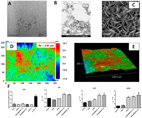 CNT/MNCNT composite-coated 316L stainless steel alloys. (A) Transition electron microscopy of MWCNT. (B) SEM of nano HAp-deposited MWCNT. The square illustrates the MWCNT covered by nHAp crystals, and the circle illustrates a region containing pure nHAp crystals. (C) SEM, (D) optical images from profolometry, and (E) 3D constructions extracted from profilometry of nanoHAp/MWCNT-deposited 316L stainless steel. (F) Intracellular lactate dehydrogenase (LDH) release and expression of osteogenesis-related genes (OC: osteocalcin, ALP, OPN). An asterisk (*) denotes significant difference compared to the control of the same day. Data reproduced from Ref. [96]. Copyrights MDPI 2015.