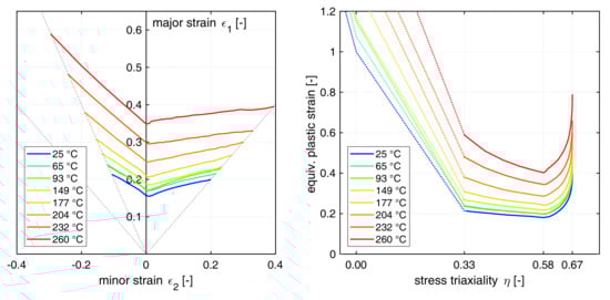 The second study investigates the forming limits of the given example by a combination of the generalized Johnson–Cook approach presented by Buyuk [30] from Equation (12) with the Barlat89-2D yield locus as described in Section 2. In analogy to the method proposed by Buyuk [30], the temperature dependent failure surface is created by multiplying the baseline failure envelope at room temperature by the stress state invariant temperature scaling function C] ÷ C].