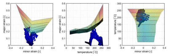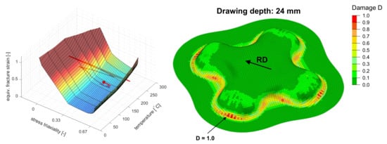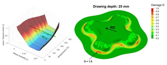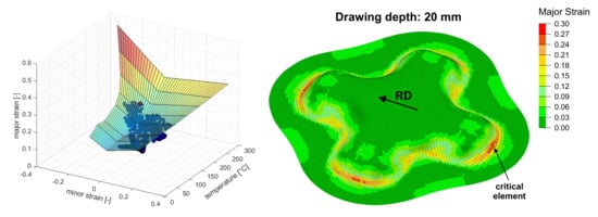 As shown in Figure 4, the onset of necking was predicted in rolling direction at the ends of the cross-die arms at a drawing depth of 20 mm. The corresponding 3D FLD in different views is given in Figure 5. Failure occurred in a critical element at a near plane strain state of () and a temperature of C.