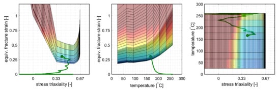 whereby the variables and denote the equivalent plastic fracture strain and the equivalent plastic instability strain as arbitrary functions of the current stress triaxiality and temperature T, respectively. In contrast to Equation (10), in the GISSMO approach a non-linear damage accumulation is introduced through the damage exponent n. Furthermore, in this current study the dependency of the equivalent strain to fracture on strain rate is neglected to establish comparability with the FLC approach. Calculating the derivatives of Equations (13) and (14)
