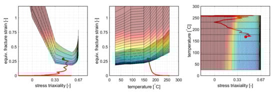 The occurrence of necking was predicted in the transverse direction at the ends of the cross-die arms at a drawing depth of 25 mm. The underlying fracture surface and the load path of the critical element as well as the cross-die cup at the critical drawing depth are depicted in Figure 6. The failure surface and the load path of the critical element are depicted in Figure 7 in different representations. The predicted occurrence of necking was flagged as a dot. Failure occurred in a critical element at a stress state between uniaxial tension and plane strain of and an equivalent stain of . The temperature at failure was C.