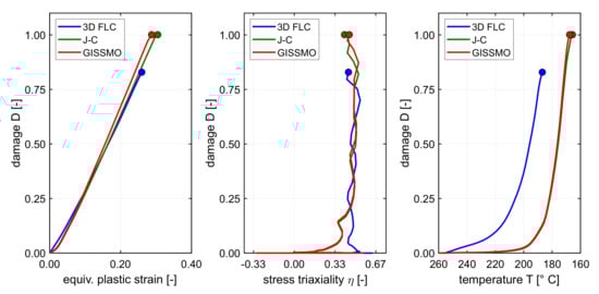 Within this numerical study the GISSMO fracture framework was used as an instability indicator. Thus, the scalar value D was to be interpreted as the onset of localized necking and not as the risk of material separation. Coupling between damage and stress as given by Equation (19) was deactivated for the purpose of this study. The damage exponent was set to which is in line with the original formulation of Johnson and Cook [29]. Therefore, the damage was accumulated linearly. In this way a direct comparison between a stress state independent (Section 5.2) and a stress state dependent temperature scaling (this section) was possible.