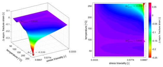 In order to quantify the difference between the stress state invariant temperature scaling of the baseline failure curve, on which the JC-like approach is based, and the actual forming limits of the investigated sheet material used in GISSMO, the difference between both failure strains is plotted in the sheet metal forming relevant “biaxial tension valley”, . The differential plot presented in Figure 11 shows that the overestimation of the JC-based assumption becomes larger with higher triaxialities and temperatures and amount up to with respect to the actual forming limit. For low triaxialities and temperatures the differences are negligible and approximately . In turn, in applications dominated by uniaxial tension (), the JC-like method will provide a decent prediction of the actual forming limit. In applications at higher temperatures dominated by biaxial tension (), as for example non-isothermal sheet metal forming, a simple scaling of the baseline failure curve by a fixed ratio of C] ÷ C] will lead to significant deviations between the predicted and the actual failure strain given by FLCs.