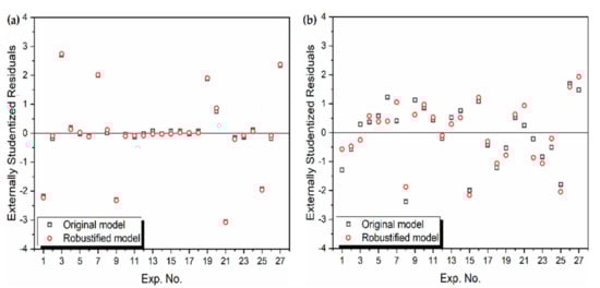 Thus, the stepwise elimination method is used and the ANOVA of the robust mathematical models is presented in Table 2. It is seen that all the model terms in Table 2 have p-values much smaller than 0.1, indicating the adequacy of the developed models. The comparison of the various accuracy metrics for the previous [42] and current model is presented in Table 3. Further, Figure 1 shows the comparison of the residuals of the models. For MRR, as seen in Figure 1a, the improvement is minor. However, as seen from Figure 1b, for the model there is a significant improvement. Thus, these developed models are used as objective functions for multi-objective optimization in the next section.