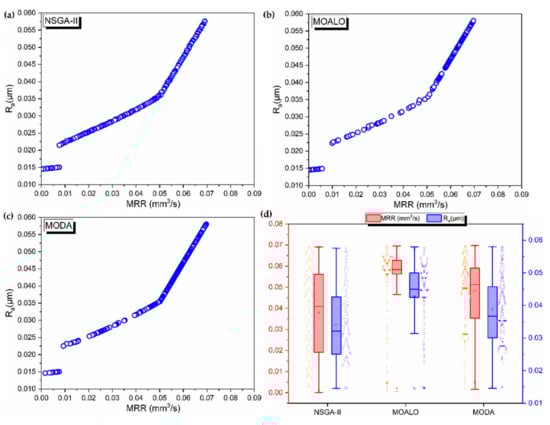 The Pareto fronts generated by the three algorithms are presented in Figure 2. It is seen that a small discontinuous zone is present in all the Pareto fronts at low MRR and low combination, indicating that no non-dominated solutions are present in that region. Further, the NSGA-II is seen to be better in the continuity of the Pareto fronts as compared to MOALO and MODA. Especially in the case of MODA, two more distinct breaks in the Pareto front are seen. The spread of the Pareto fronts is analysed by using box plots in Figure 2d. The spread is closer to normal distribution for NSGA as compared to MODA and MOALO.