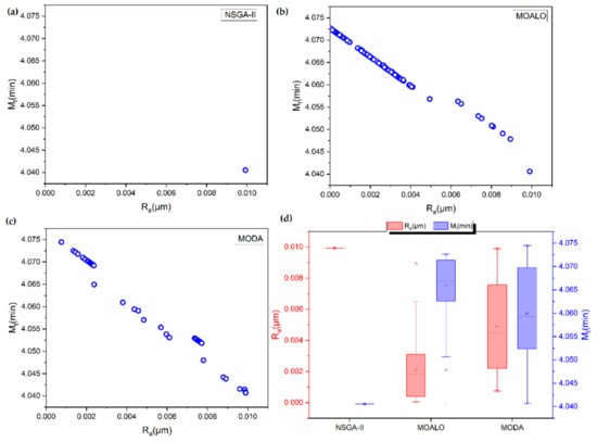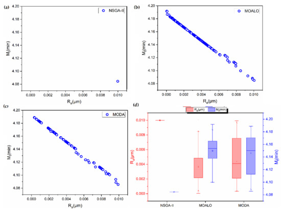 The Pareto fronts obtained using the NSGA-II, MOALO and MODA for micro-end milling of a 700 μm size slot is presented in Figure 3. It is seen that the NSGA-II is unable to find a Pareto front for the problem. The Pareto fronts generated by MOALO and MODA are highly discontinuous, indicating the absence of suitable non-dominated solutions. MOALO and MODA Pareto fronts have 124 and 52 non-dominated solutions, respectively. It is seen that low surface roughness is achieved by operations involving high machining time, indicating a very low cutting speed and a low feed rate. The analysis of the spreads of the Pareto fronts using box plots in Figure 3d show a better spread of MODA.