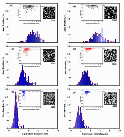 The structure and corresponding cell size distribution (red line: fitting of lognormal distribution function) and circularity of foam specimens: (a) 5TiB2-0.1P; (b) 5TiB2-0.24P; (c) 5TiB2-0.4P; (d) 10TiB2-0.1P; (e) 10TiB2-0.24P; (f) 10TiB2-0.4P.