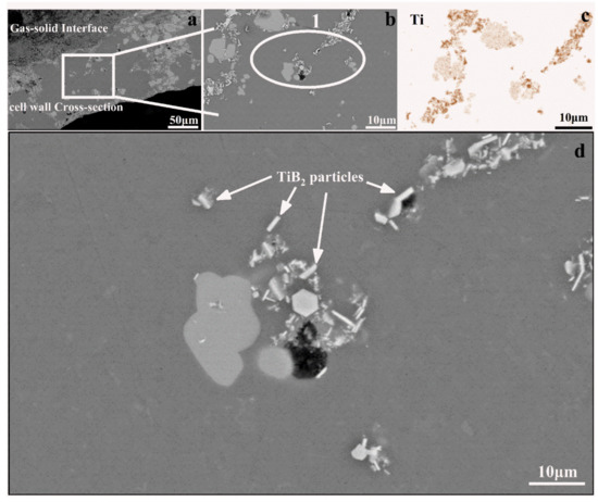 SEM images of Al-5TiB2 composite foams: (a) cell wall cross-section; (b) a magnified view of the cell wall; (c) the corresponding Ti elemental mapping in b and (d) is a magnified view of the region marked by Circle 1.