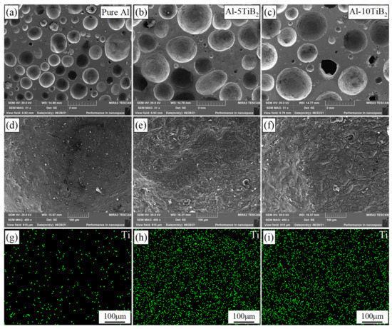 Ti elemental mappings of three different matrix compositions (pure Al, Al-5TiB2, and Al-10TiB2) in the gas–metal interface: (a–c) macro morphology and (d–f) gas–metal interface of (a–c), respectively; (g–i) Ti elemental mappings of (d–f), respectively.