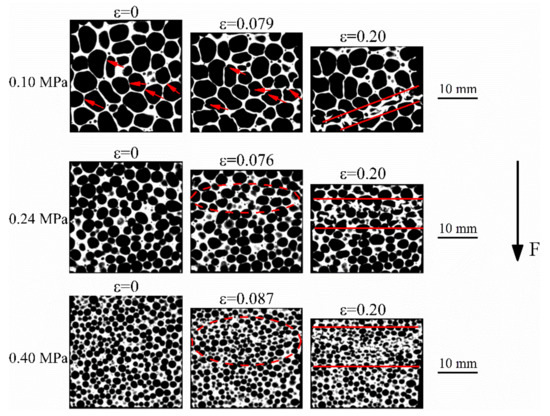 Tomographs obtained from the 5TiB2 and 10TiB2 foams that were deformed with up to 8% (or 6%) and 20% strain are shown in Figure 7 and Figure 8, respectively. At 8% (or 6%) strain, the cell walls of the 5TiB2 (or 10TiB2) plastically buckle perpendicular to the load direction, and some cell walls produce slight buckling parallel to the load direction, as shown by the arrows and ellipse zones. However, in the case of 10TiB2-0.24P and 10TiB2-0.4P, the plastic deformation is not obvious. At 20% strain, the deformation band (the zone between the two red lines) is a mixture of both ductile and brittle in nature in the case of 5TiB2-0.1P since both buckling and cracking of thin cell walls can be observed. However, for 10TiB2-0.1P, the obvious cracking of the cell walls can be observed in the deformation band, which is consistent with the report that the cell wall of 10TiB2 foams is highly brittle in nature [16]. For 5TiB2-0.1P and 10TiB2-0.1P, the site of the onset of local deformation usually initiates at larger cells generating a concentration of stress in adjacent areas [21,22]. Nevertheless, 10TiB2-0.24P and 10TiB2-0.4P foams form deformation bands at 45 degrees to the compression direction. The 5TiB2-0.24P and 5TiB2-0.4P foams show approximately horizontal deformation bands. This may be related to the nature of the cell wall material. It is reported that the 10TiB2 foams are very brittle in nature during compression, while such brittleness is not so prominent in the 5TiB2 composite foams [16,20]. Therefore, 10TiB2 foams tend to experience shear deformation.