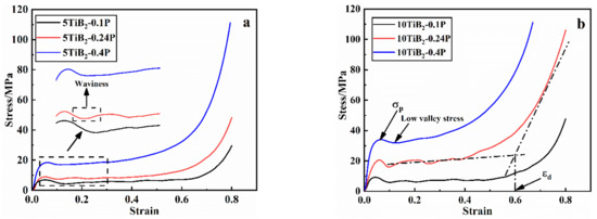 Compressive stress-strain curves of the foams: (a) 5TiB2 and (b) 10TiB2.