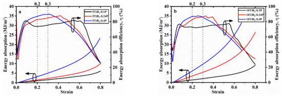 The energy absorption and energy absorption efficiency (η) curves of the foams are shown in Figure 10. η is obtained by the following equation [14]: