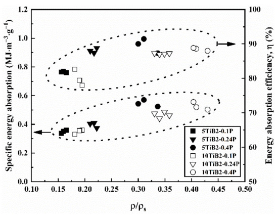 where m is the structure’s total mass. It can be seen that the SEA and η of the composite foams increases when the relative density increases. The energy absorption efficiency is related to the smoothness of the plateau stage in the stress-strain curves. As the pressure increases, a uniform cell structure with fine bubbles is obtained (see Figure 3). This leads to the simultaneous crush of multiple cells (see Figure 7 and Figure 8) and the decrease of fluctuations in the stress-strain curves when pressure increases. As a result, the energy absorption efficiency increases with increasing pressure. In addition, the energy absorption efficiency of the 5TiB2 foam is superior to that of the 10TiB2 foam, as shown in Figure 11. The ductile and brittle deformation nature for the 5TiB2 and 10TiB2 foams, respectively, are shown in Figure 7 and Figure 8, which can support this result.