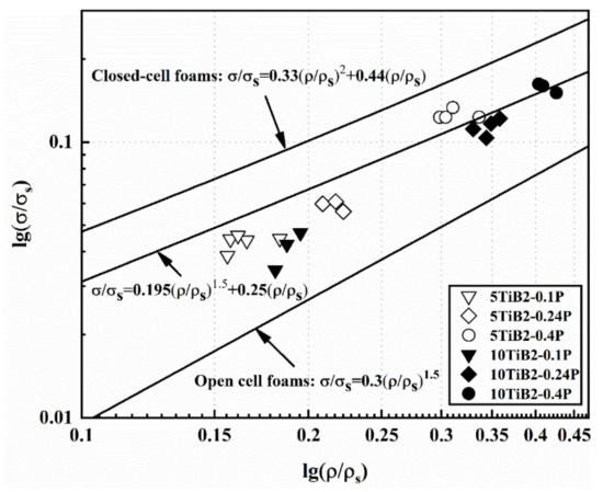 The comparison of the experimental data with the prediction models is shown in Figure 12. The yield strength of the base material is taken to be the reference value (150 MPa and 200 MPa for 5TiB2 and 10TiB2, respectively) [16]. The discrete points shown in Figure 12 are the experimental data of the composite foams fabricated under different pressures. It is clear that the strength of the composite foams fabricated under the condition of less 0.20 MPa is slightly lower than the prediction (6). As shown in Equation (4), the contribution from cell edge bending to the overall strength of the foam is by a term that is non-linear in the relative density, while the contribution from cell face stretching is linear in the relative density. In addition, the relative density is much less than 1. Therefore, the influence of cell wall geometry on strength is particularly important. The discrepancy between the experimental data and the prediction model (6) is mainly due to defects, such as cell wall curvature and corrugation, porous inclusions, holes, fractured cell walls, and non-uniform distribution of local density [4,25,27,31]. According to reports, when the ratio (L/2R) of the cell wall length (L) to the curvature radius (R) increases from 0 to 0.5, the strength of closed-cell foams is reduced by 32% to 55% compared to foams with a flat cell wall [32]. However, for composite foams fabricated under the condition of 0.40 MPa, the specific strength is essentially consistent with the prediction model (6). This may be due to the uniform cell structure obtained under increased pressure (see Figure 3), resulting in a reduction in the pressure difference between adjacent cells, which helps to obtain a flat cell wall.