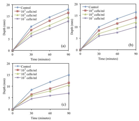 Increase in water penetration depth w.r.t. time for control and microbial mortar samples (a) 3 days, (b) 7 days, and (c) 28 days (reproduced with permission from ref. [37]).