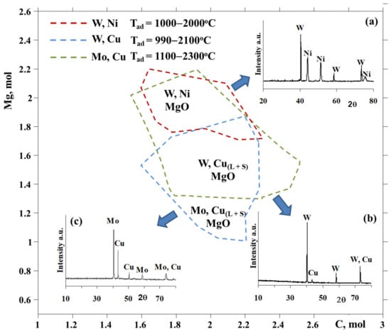 Thermodynamic modelling of WO3-CuO-yMg-xC, WO3-NiO-yMg-xC and MoO3-CuO-yMg-xC systems and XRD patterns of the products (W-Ni (a), W-Cu (b) and Mo-Cu (c)) at optimum conditions, P = 0.3 MPa.