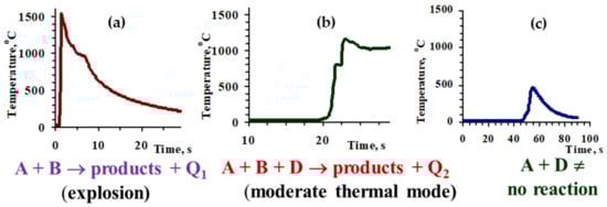 SHS processes use only high-caloric reacting mixtures, enabling to generate a sufficient amount of energy, or often, despite being highly exothermic reactions, they cannot proceed in a self-sustaining manner, owing to strong diffusion retardation. On the other hand, reactions with a very high thermal effect are also not suitable for the materials’ synthesis, since they proceed too violently, in a non-controllable explosion mode that leads to the non-complete conversion of reagents, evaporation of precursors and intermediates, agglomeration, etc.