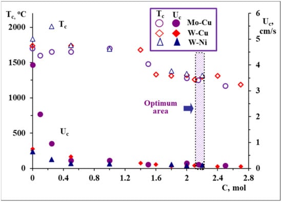 Combustion temperature (Tc) and combustion velocity (Uc) vs. carbon content in the WO3-CuO-1.3Mg-xC, WO3-NiO-1.7Mg-xC and MoO3-CuO-1.2Mg-xC systems. P = 0.3 MPa.