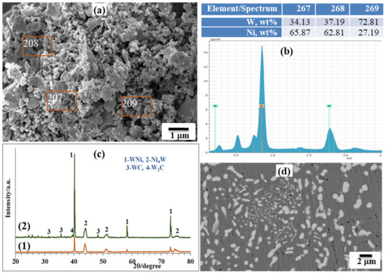 The target SHS product was crushed into a powder after cooling and hydrochloric acid leaching was used to eliminate byproduct magnesia. XRD and SEM/EDS examinations showed that the product after acid treatment contained mainly Ni and W elements, with an average particle size in the submicron range (Figure 5a,b), illustrating the homogeneous dispersion of both metals throughout the sample. It is obvious that the characteristic peaks of tungsten are broadened and correspond to the W-Ni solid solution, and that the nickel peaks are right-shifted and broadened (Ni-W solid solution).