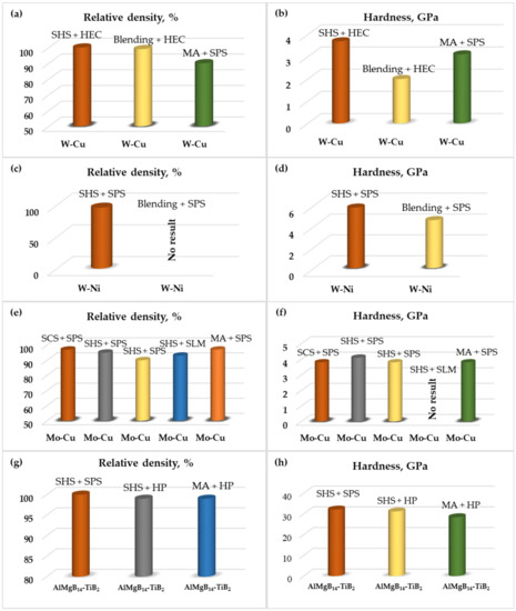 Comparing the properties of W-Cu composites that were produced by both SHS and blending and consolidated by the same method (HEC), the advantages of SHS-produced powders are obvious in terms of the density and microhardness of the composite, whereas the SPS consolidation of W-Cu nanopowders did not allow to achieve a density >90% [40] (Table 1, Figure 10). However, the particle size of the initial precursor had a strong influence on the hardness value. After SPS, the W-Ni compacts prepared from powders derived by SHS exhibit an enhanced hardness as compared to the compacts produced from the blended precursors. There are no literature data on the consolidation of the Ni-W system via HEC; however, Fe-Ni-W and Al-Ni-W were successfully compacted by HEC [41,42]. Ni-W materials are usually obtained by powder metallurgy methods, such as long-term sintering at a temperature of 1350–1500 °C. In the presence of a liquid phase, the tungsten powder is recrystallized with the formation of almost spherical particles, which are tens of times larger than the particles of the initial powder. The production of the W-Ni powder is possible by SHS at a combustion temperature below the melting point of the constituents, which contributes to the fine powder production. Cu-Mo materials with a homogeneous microstructure are difficult to achieve with conventional methods. Bulks produced from SCS and MA-derived Cu-Mo composite powders demonstrated similar properties after SPS and up to a 97% density. MA is shown to have a beneficial influence on the mechanical properties. Up to now, for the fabrication of high-density Cu-Mo compacts (98–99%), the laborious and expensive method of the liquid phase sintering of the pre-alloyed Mo-Cu nanopowder (100–200 nm) is still preferable. The SLM method is shown to have a perspective for the preparation of pseudoalloys comprising two or more distinctly different metals, but insufficient data are available in the literature so far.