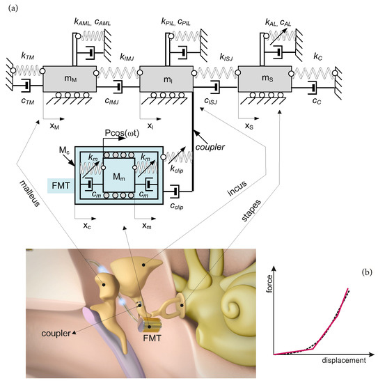 The human middle ear is composed of three ossicles, i.e., the malleus (), the incus () and the stapes (), as shown in Figure 1. The bones are connected to each other by means of joints: the incudo-mallear (IMJ) and the incudo-stapedial (ISJ); and to the temporal bone by ligaments: the anterior malleal (AML), posterior incudal (PIL) and stapedial annular (AL). Damping and stiffness properties of the joints and ligaments are denoted by and , respectively. The middle ear is attached to the tympanic membrane whose viscoelastic properties are described by and . On the opposite side, the middle ear is attached to the cochlea. The properties of the cochlea fluid are denoted by and . The AL is assumed to have nonlinear stiffness characteristics, as reported in [15]. This middle ear model (without the implant) was also used in [16] to analyze the intact ear. Validation of the model based on the experimental results was successful, and therefore the model is used in this paper for modeling the implanted middle ear (IME). To obtain the IME model, the FMT (gray part in Figure 1) is attached to the incus by means of a coupler. Then, a five-degrees-of-freedom (5dof) model of the IME was obtained, as presented in Figure 1a. A similar model was also used in [17], where the IME was analyzed under different excitation conditions with a fixed coupler stiffness coefficient. The present study proposes a new concept of the coupler with constructional or material cubic nonlinearity presented schematically as the dashed line in Figure 1b. The former nonlinearity can be achieved using a typical (commonly used) titanium coupler of special design that provides increasing stiffness with a deflection. For instance, the stiffness of the coupler can be piece-linear (the solid line in Figure 1b). The latest one is represented, e.g., by shape memory alloy (SMA), which is used sometimes in a middle ear prosthesis [18] to fix a prosthesis head to the stapes arch. The SMA coupler could be a self-clamp element when heating without any external force. The SMA element used in the middle ear is described as a five-order polynomial, but the newest findings indicate that a three-order function is enough for small vibrations that occur in the ear structure [19,20].
