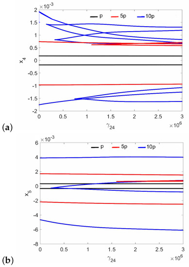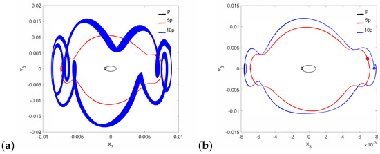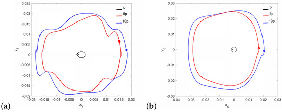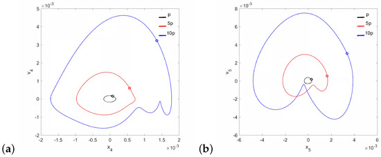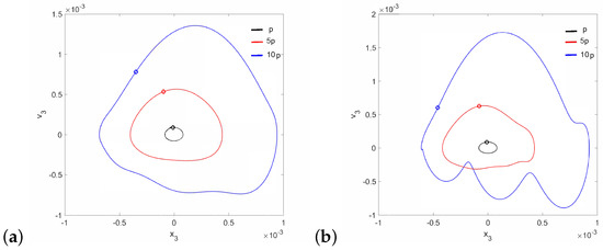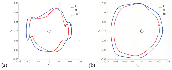 Regular attractors of the stapes motion are shown in Figure 4. Nevertheless, some symptoms of polyharmonic motion are observed in Figure 4b (the blue curve). A similar behavior pattern can be visible for the can and the magnet of the FMT in Figure 5, while an increase in causes the phenomenon of attractor crossing for the excitation values of and (Figure 6). Interestingly, the period of vibration remains the same and equals 1T, which corresponds to the excitation frequency.
