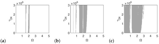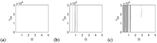 Regions of polyharmonic vibrations of the can in case of the pathological ear versus the nonlinear stiffness rate of the coupler () and the excitation frequency () under excitations of p (a), 5p (b) and 10p (c).