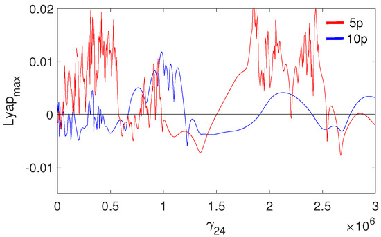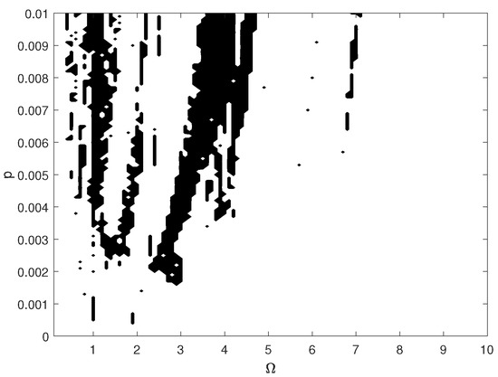 The pathological ear exhibits a more complex behavior than the normal ear, including chaotic motion. Chaos may be hard to notice in the bifurcation diagrams because the diagrams were created for one set of initial conditions. For clarity, the system dynamics is therefore illustrated in a more comprehensive way using the maximal Lyapunov exponent (LE, Figure 17). Chaos occurs when and when . Interestingly, a higher excitation force can sometimes lead to regular motion, whereas a higher nonlinearity causes motion irregularity, although this may not be clear when looking at the bifurcation diagram shown in (Figure 10). It is expected, however, that a change in the excitation amplitude and frequency will also lead to chaotic motion. The regions of irregular motion are shown in Figure 18 as a two-parameter plot. The black areas indicate and p where the maximal value of the Lyapunov exponent is positive. Thus, chaos exists near = 1, 2, 3, 4 and 7, whereas at the system is free from chaos, whatever the excitation amplitude (p). The range between 7 and 10 can be regarded as unconditionally regular.
