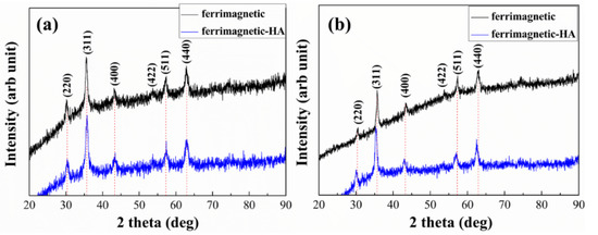 X-ray diffraction patterns of the ferrimagnetic and ferrimagnetic-HA nanoparticles prepared using (a) the coprecipitation method and (b) the hydrothermal synthesis method.