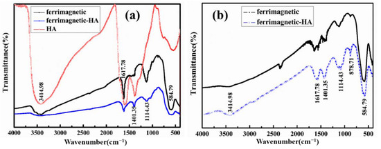 FTIR is an established tool to identify functional groups of molecules and can analyze the surface groups of the samples. Figure 3a exhibits FTIR spectra of HA, ferrimagnetic and ferrimagnetic-HA nanoparticles prepared using the coprecipitation method. The absorption peak at 584 cm−1 was attributed to the characteristic absorption of the stretching vibration of Fe-O bond. The absorption peak of 1114 cm−1 came from the hydroxyl group. All samples showed the absorption peaks of 1617 cm−1 and 3414 cm−1, which may be due to the vibration of adsorbed water molecules. Compared with ferrimagnetic nanoparticles, the composite nanoparticle appeared the absorption peak of C=O stretches at 1401 cm−1, indicating that the humic acid has been successfully bonded onto the ferrimagnetic nanoparticles [18]. Figure 3b shows FTIR spectra of ferrimagnetic and ferrimagnetic-HA nanoparticles prepared using the hydrothermal synthesis method. It can be seen that the nanoparticles exhibit the same absorption peaks as the one prepared using the coprecipitation method. Furthermore, the ferrimagnetic-HA nanoparticles showed an absorption peak of C=O that stretches at 1401 cm−1. The above results indicate that HA has been successfully bonded onto the ferrimagnetic nanoparticles prepared by the two methods.