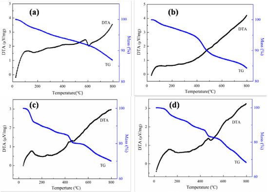 To obtain the thermal stability of the nanoparticles, thermogravimetric analysis was performed under a nitrogen atmosphere, and the heating rate was 10 °C/min. Figure 4 presents the TG and DTA curves of ferrimagnetic and ferrimagnetic-HA nanoparticles prepared using the coprecipitation method and hydrothermal synthesis method. It can be seen that the mass of all samples decreases with the increase of temperature, which mainly comes from the adsorbed water and solvents during the preparation process. The weight loss at temperatures ranging from 30 °C to 100 °C is mainly due to moisture and adsorbed gases. The mass loss near 400 °C is mainly caused by the phase transformation of ferrimagnetic nanoparticles, that is, Fe3O4 is transformed into α-Fe2O3. Compared with ferrimagnetic nanoparticles, the hybrid nanocomposites exhibit greater weightlessness between 400 and 500 °C. This may be attributed to the contribution of decarboxylation and pyrolysis of aromatic nucleus of the condensed ring in HA.