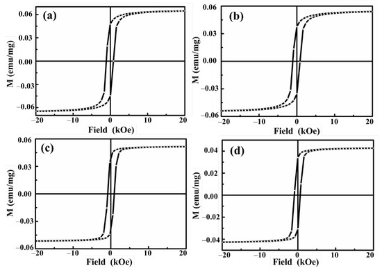 Magnetic hysteresis loops of (a) ferrimagnetic and (b) ferrimagnetic-HA nanoparticles prepared using the coprecipitation method, and (c) ferrimagnetic and (d) ferrimagnetic-HA nanoparticles prepared using the hydrothermal synthesis method measured at room temperature.