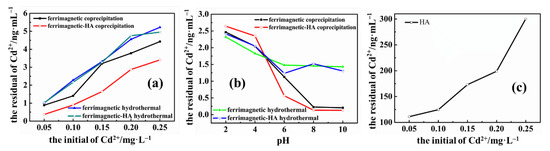 To obtain the adsorption effect of nanoparticles on heavy metals, the concentration of Cd2+ in water was analyzed by ICP. The main parameters that affect the binding of heavy metal ions to ferrimagnetic-HA nanoparticles are the concentration of metal ions, pH and other parameters. Therefore, the effects of the initial heavy metal concentration and solution pH on the removal of heavy metal ions by ferrimagnetic-HA nanoparticles and HA were investigated, respectively. As shown in Figure 6a, the concentration of the remaining Cd2+ in the solution is increased with the increase of the initial concentration of Cd2+. The reason is that when the number of ferrimagnetic-HA nanoparticles remains the same, the number of active sites on the surface of ferrimagnetic-HA nanoparticles is also constant. With the increase of the amount of Cd2+, the active sites on the surface are gradually occupied by Cd2+, which leads to the decrease of the adsorption effect. In addition, the pH of the solution is also an important factor affecting the adsorption effect, which can be seen in Figure 6b. The initial concentration of Cd2+ was 0.10 mg/L. With the increase of pH, the concentration of residual Cd2+ in the solution gradually decreases and tends to remain constant. Moreover, the adsorption effect of the adsorbents prepared by the coprecipitation method is better than that prepared by the hydrothermal synthesis method. This result is consistent with the previous morphological analysis results. As can be seen from Figure 2, the size of nanoparticles prepared by the coprecipitation method is smaller than that prepared by the hydrothermal synthesis method. At this time, the number of active sites on the surface increased, and thus, the nanocomposite prepared by the coprecipitation method has a high adsorption effect. Figure 6c exhibits the effect of the initial heavy metal concentration on the adsorption efficiency for HA only. It can be seen that HA also has a certain adsorption capacity for heavy metal. When ferrimagnetic nanoparticles and HA were combined, the adsorption effect of nanocomposites was stronger than that of HA and ferrimagnetic nanoparticles separately. As a result, the combination of HA and ferrimagnetic nanoparticles can significantly enhance the adsorption effect of the adsorbent, and achieve the purpose of synergistic removal of heavy metals. This can be attributed to the fact that HA has a large number of active functional groups on the surface, so it can be further complexed with heavy metals to improve the adsorption effect.