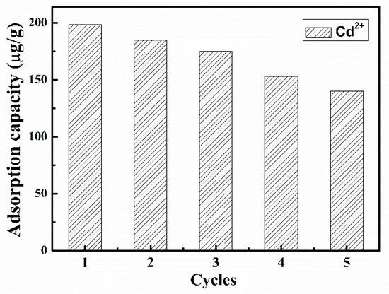 Regeneration and reuse of adsorbent are essential for economic use. For ferrimagnetic-HA nanocomposite particles, magnetic technology can be used to realize the recycling of adsorbents. In this study, desorption behavior was studied using 0.03 M of EDTA solution, as shown in Figure 7. The adsorption capacity of Cd2+ decreased gradually with the increase of regeneration cycle. After the fifth cycle, the loaded amount of Cd2+ was 70.6% of the amount by the fresh adsorbent, demonstrating that ferrimagnetic-HA nanoparticles could be regenerated and reused using EDTA.