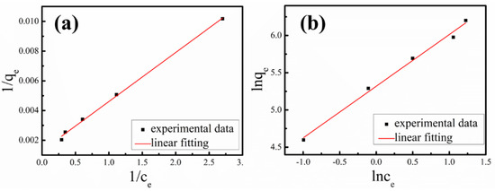 1/qe was plotted against 1/ce (Figure 8a), and the maximum sorption capacity qm can be obtained from the linear fitting result: