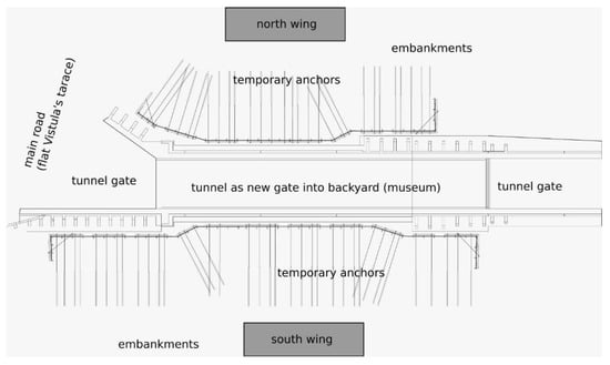 The described adaptation requires a cross-cut in the embankment and protection of the excavation in the embankment. The first stage of implementation of the entrance to the designed museum object requires the demolition of approximately 54 m of the Carnot wall. The excavation under investigation was carried out in an uncontrolled anthropogenic substrate and in non-cohesive and cohesive subsoil. The task requires the identification of a substrate made of anthropogenic soils in which excavation and estimation of geotechnical parameters will be carried out. After the Carnot wall had been demolished and the soldier pile wall was completed, the work was in progress to create the excavation. The further stages of the structure are presented in Figure 5 and Figure 7.