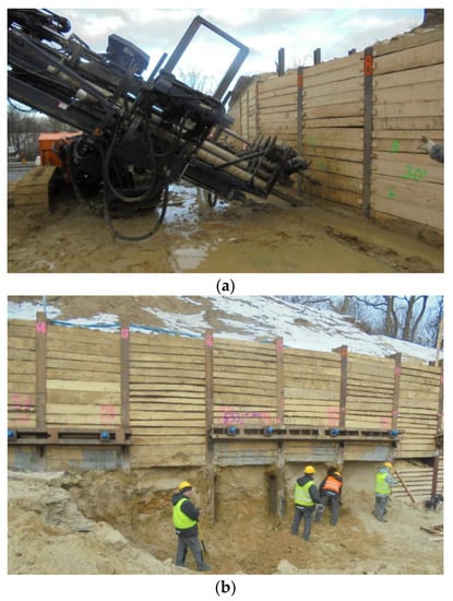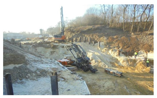 The anchors were installed using the Hütte HBR 609-3 set. This is a hydraulic drilling rig for micropiles and ground anchors, foundation construction, soil investigation and slope stabilization. The most important parameters are engine power 209 kW, extraction force 100 kN, crowd force 100 kN and working extraction speed 17.5 m/min. The diameter of the casing used was 133 mm. The device performs the entire technological process of creating the anchor quickly and efficiently. The anchors were drilled with a gimlet bit in pipe casing with water flush. Upon making a borehole, grout injection was carried out and then the anchor bearing element—a set of wires—was installed with double corrosion protection (DCP) to ensure a prolonged lifespan; the element was equipped with spacers, injection hoses and separator(s). Primary pressure grouting was applied through the casing every 2 m during its removal, and then the pressure applied was 1 MPa. After approximately 24 h, all anchors were grouted by tube-a-manchette with a pressure of 6–7 N/mm2. During primary and secondary pressure grouting, the grout used had w/c = 0.50 and was produced from CEMII 32.5R. Finally, 7 days later, the anchors were tested, compressed and stabilized with anchorage (Figure 9a).