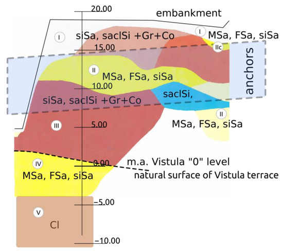 Geotechnical investigations of the substrate in the area of the designed cutout included the geotechnical drilling hole and cone penetration tests (CPT) [40]. As a result of anthropo-pressure, which especially intensified during the Citadel’s erection, the primary terrain was leveled and additionally reinforced by building up a layer of anthropogenic embankments. The sediments lithologically comprise the following materials: clayey sands, sandy clays and silty clay with stiff-consistency gravels and cobbles. All of the above-mentioned sediments are of Quaternary origin. Older subsoil, i.e., from the Tertiary and Pliocene periods, was found at the bottom of the scarp.