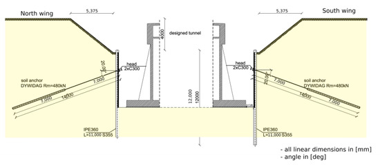Details of excavation protection: design phase, with location of anchors in typical cross-section (linear dimensions are in [mm], angles in [deg]).