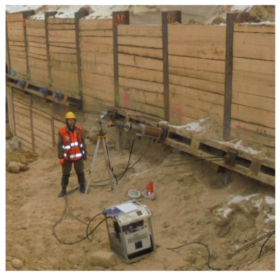 As part of site investigations, excavations, ground anchor testing and other engineering works, boreholes are crucial for understanding Warsaw Citadel’s geodiversity. The designers used anchors as temporary supports for soldier pile walls (Figure 5). During construction, it was possible to look closer at the substrate and uncover some mechanical dependencies [41,42]. The standard [43] provides the general definition: an anchor is a structure capable of carrying tensile loads through a free length of a tendon onto a support layer. On the other hand, for an injection anchor, it is specified that an anchor with a bolt solidified by the injection of resin, cement grout or other material transfers the tensile force to the ground. The standard [44] applies to temporary or permanent soil anchors that are ground-bonded by injection, compressed and tested according to the strictest safety measure described. The field test of the anchor head is shown in Figure 8. The measuring set consists of a dial indicator sensor and an actuator (conventional hollow-piston cylinder).