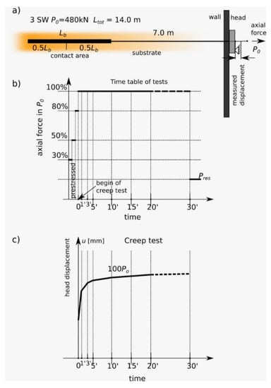 Example of a graphic anchor creep test report: (a) profile of 3SW-type anchors, which were used in construction and tested; (b) schedule of load–time procedure in experiments; (c) typical creep result chart.