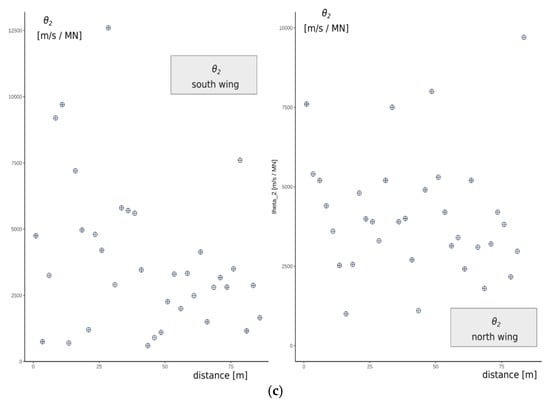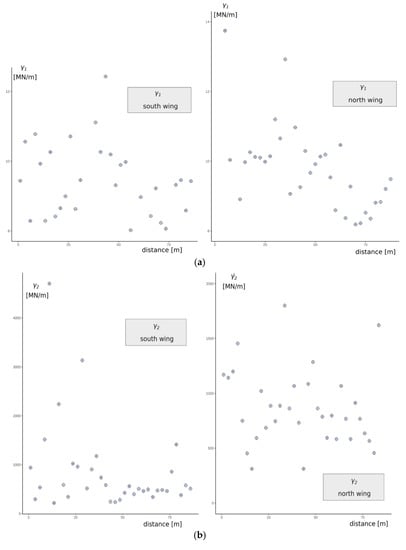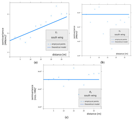 The high value of the nugget effect in the semivariogram analyzed in Figure 12 and Table 3 and its linear theoretical model indicates significant randomness and diversity of the parameter values for the south wing, while the character of the variation in this parameter for the north wing is presented differently, as shown in Figure 13 and Table 4. Here, the semivariogram is described by a spherical model, and a smaller value of the nugget effect can be observed, which means greater homogeneity of the material. Differences in the origin of the material and methods used to erect the embankments surrounding the Warsaw Citadel are evident on both sides associated with adjacent masses of anthropogenic embankments subjected to the analysis of the variability of elastic features of the rheological model of the subsoil. The spatial variability of the feature in Figure 12b and Figure 13b and in Figure 12c and Figure 13c is supported by significant divergences between the analyzed semivariograms.