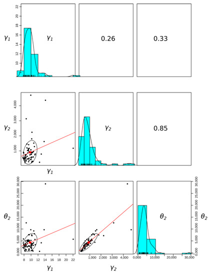 Graphical representation of Pearson covariance matrix with histograms. Fitting of linear relationships between parameters was performed for parameter values from both wings. The position of the graph in the figure is indicated by (row,column): (1,1) histogram of , (2,2) histogram of , (3,3) histogram of , (1,2) correlation coefficient between and , (1,3) correlation coefficient between and , (2,3) correlation coefficient between and , (2,1) plot of vs. , (3,1) plot of vs. , (3,2) plot of vs. .