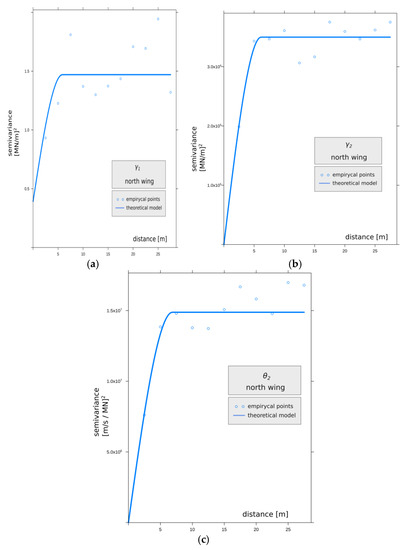 The graph shows points on the empirical semivariogram for the north wing. The line was fitted by the least square method (LSM) of the theoretical model for the parameters: (a) , (b) , (c) .