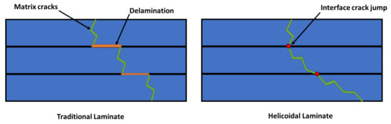 Following these considerations and analysing the effect of ply angle on the failure behaviour of composite materials, it is possible to observe that the smaller the angle used between two consecutive plies, the higher the delamination fracture toughness. On the other hand, increasing the ply angle, the delamination fracture toughness decreases. Hence, when the angle between two adjacent plies changes by a large quantity, the crack prefers to propagate along the interlayer interface instead of generating intralaminar cracks since the fracture energy required for creating delamination is lower. On the other hand, when smaller angles are used, the energy required to propagate the damage along the interface is higher and, consequently, it is energy-wise easier for the crack to propagate across the matrix of the layer following the ply angle and “jump” across the interface between layers [10]. A schematisation of this concept is reported in Figure 1, where an helicoidal laminate is compared to a traditional one showing their differences in terms of failure mechanisms.