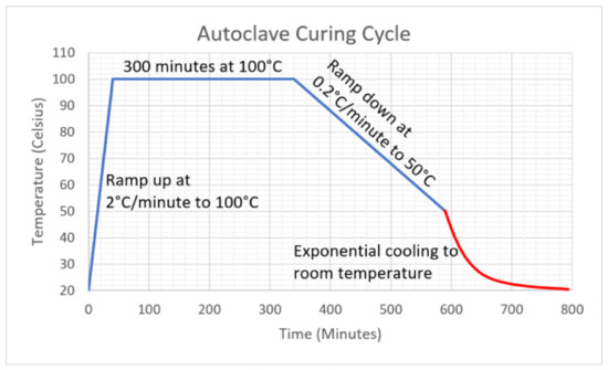 For the experimental analysis of the FGP design, unidirectional carbon fibre prepreg “XPREG® XC130” was used. Each ply was cut into 100 mm × 150 mm for the impact test and 90 mm × 270 mm for the bending samples. The lamination sequences used for the different configurations are reported in Table 1 and all the laminates were cured using the temperature cycle shown in Figure 4 in order to minimise the residual stresses [49] generated by the FGPA design (Appendix A). The final thickness of the samples is ~5.2 mm using 18 plies in total.